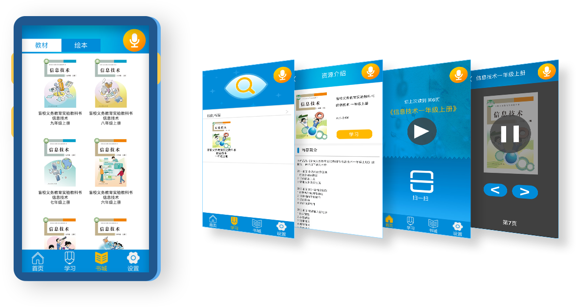 《悦读轻听》 APP 是与《盲校义务教育实验教科书 信息技术》学生用书 紧密配合的供学生使用的弱视辅助阅读学习 APP 。用户下载并安装 APP 后, 可以将教材语音数据文件通过 APP 【书城】下载到手机中使用。