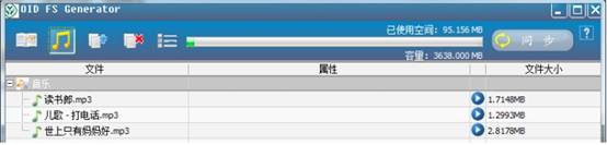 (同步按钮):在书本模式下,增加或者删除书本音频文件,在音乐模式下,增加或者删除MP3文件之后,按“同步”按钮将FS的修改结果下载到笔中。