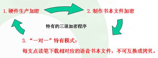 采用特有的打包技术(即“大量语音文件”打包为“一个语音文件”)的形式供点读笔使用。在打包文件上建立于隐形码一一对应的索引信息,在程序中嵌入了加密算法,将打包后的语音文件进行加密,以实现对其语音书本文件知识产权的有效保护,即可放心使用。