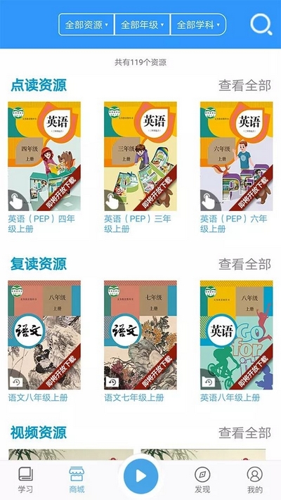 目前,人教易视听APP 已上线语文、英语等学习资源。用户通过商城栏目,可以按类型、年级、学科、关键字等方式,方便地找到所需资源,免费试用部分内容,付费下载使用全部内容。