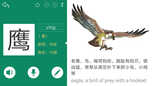 在功能方面,该软件不仅具有“查字典”“学字词”两大主要内容,而且具有汉字笔顺动画展示、字帖打印、真人标准发音示范、发音模仿评测、学习计划管理、云收藏等丰富的辅助功能,还配有大量精美的图片,可以使汉语学习更有效、更生动,也为广大用户搭建了反馈和交流的平台。